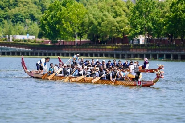 International students from Huazhong University of Science and Technology took part in a dragon boat friendship race on Wuhan's Yujia Lake. Photo provided to chinadaily.com.cn