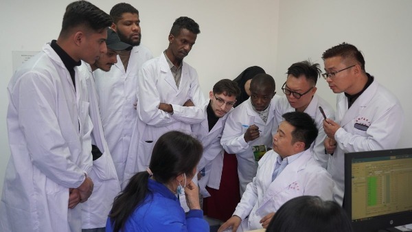 Abdeldjalil takes a TCM lecture with other international students. [Photo provided to chinadaily.com.cn]